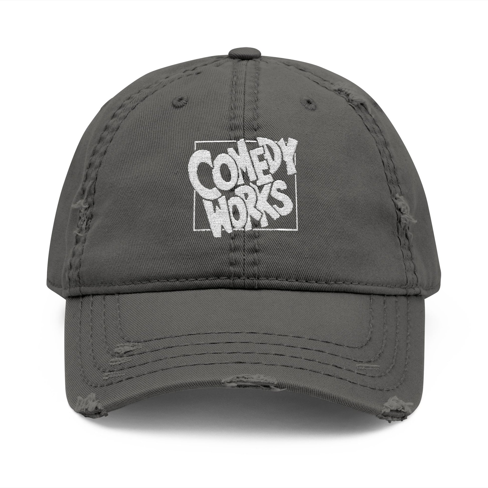 Comedy Works Embroidered White Original Logo Distressed Ball Cap